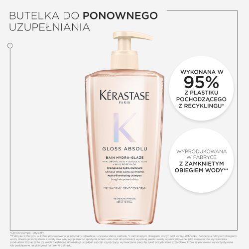 Po zużyciu butelki 500 ml z pompką możesz dokupić ekologiczny refill Kérastase Gloss Absolu Hydra-Glaze 500 ml, aby jeszcze bardziej ograniczyć zużycie plastiku i oszczędzać.