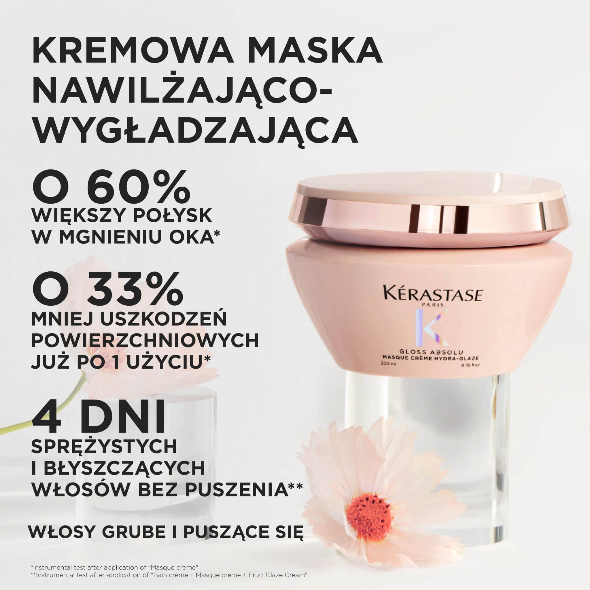 Kérastase Gloss Absolu Masque Crème Hydra-Glaze delikatnie kondycjonuje, ułatwia rozczesywanie i pomaga ograniczyć puszenie, pozostawiając włosy jedwabiście miękkie, gładkie i pełne blasku.