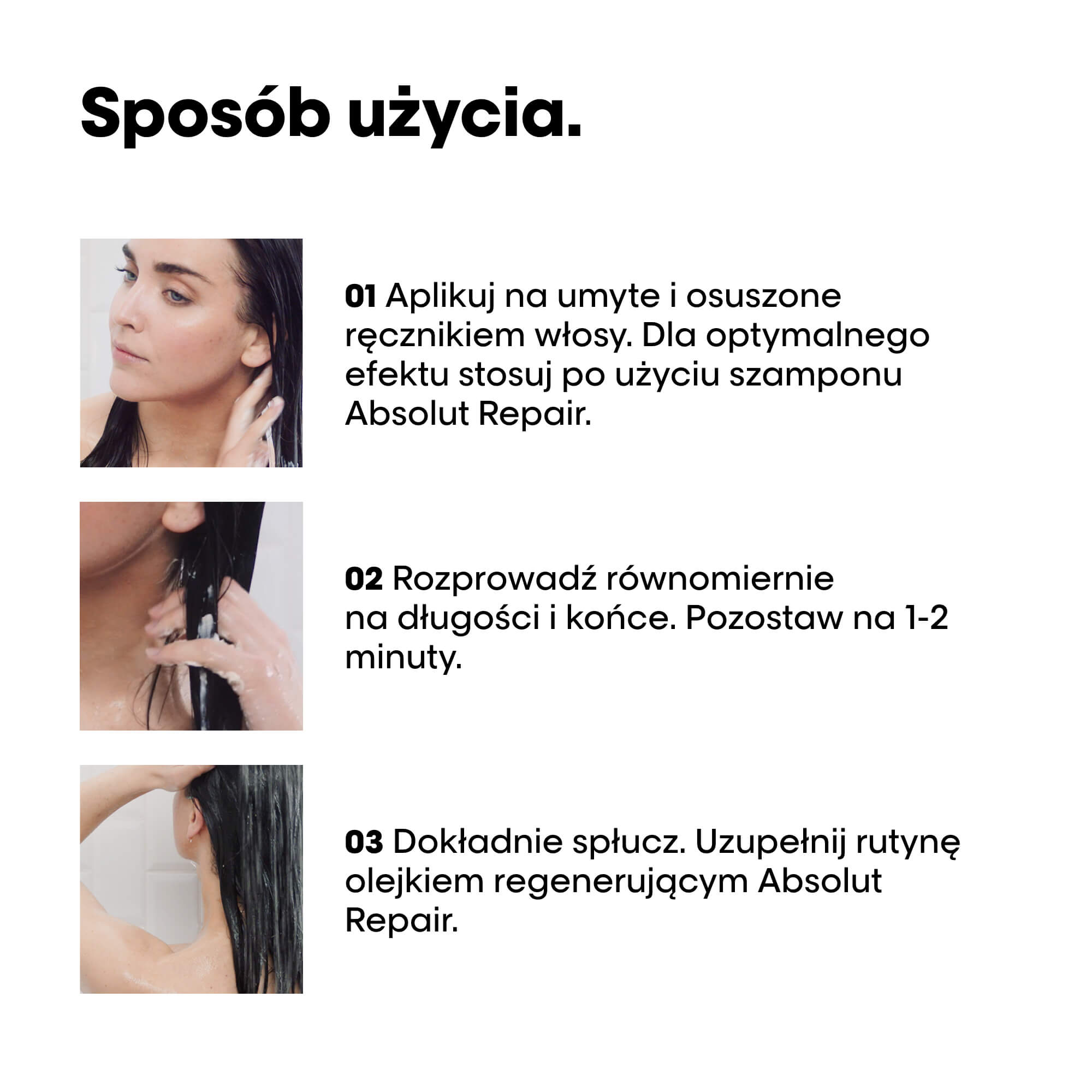 Stosuj pełną rutynę: szampon Absolut Repair + maska Absolut Repair lub do codziennej ochrony serum 10w1.