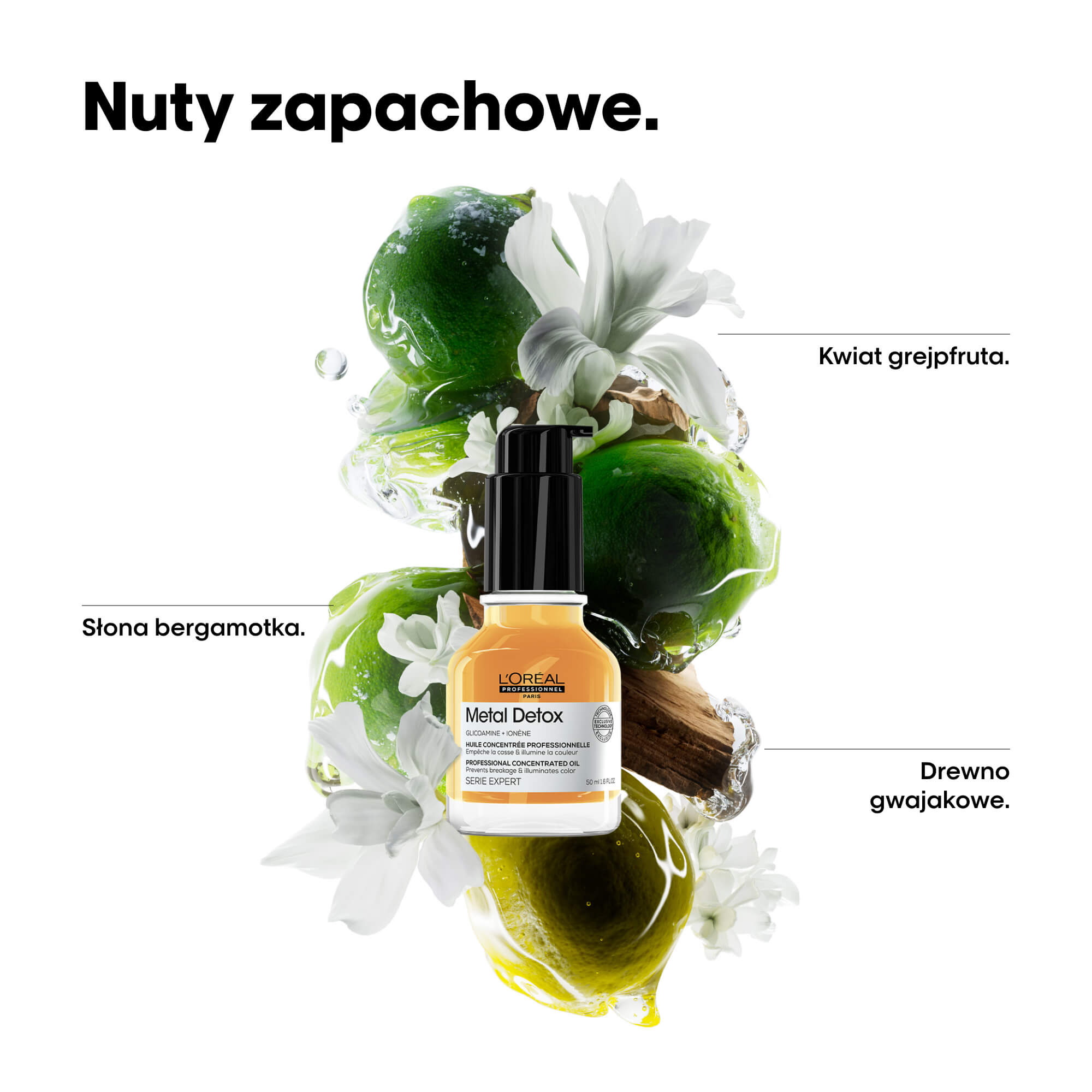 Włosy łamliwe, matowe lub tracące kolor po koloryzacji? L'Oréal Professionnel Metal Detox Olejek 50 ml to profesjonalny, skoncentrowany eliksir ochronny, który wzmacnia włosy, zabezpiecza je przed metalami, promieniowaniem UV i wysoką temperaturą aż do 230°C. Odpowiedni do każdego rodzaju włosów – farbowanych, rozjaśnianych i naturalnych.