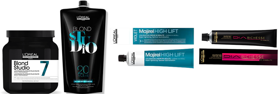 Wersja duo color, do której została użyta pasta platinium. L'Oréal Professionnel Blond Studio Platinium Plus, pasta dekoloryzująca z amoniakiem zapewnia ochronę oraz pielęgnację włosów. System Platinium zawiera Nutriceride oraz biały włosk. W składzie znajdziemy także ochronne lipidy. Produkt nie niszczy włosów. Przeznaczony jest do włosów ciemnych i bardzo ciemnych, naturalnie ciemnych oraz farbowanych. Kolejnym użytym produktem był L’Oréal Professionnel Blond Studio Nutri Developer 30 vol (9%).Niezastąpiony preparat do trwałych i półtrwałych farb do włosów. Naturalnie nawilża, rezultat koloryzacji jest jednolity. Agnieszka zastosowała do koloryzacji farbę Loreal Majirel. Całość stonowała farbą diacolor w odcieniu 8,21.