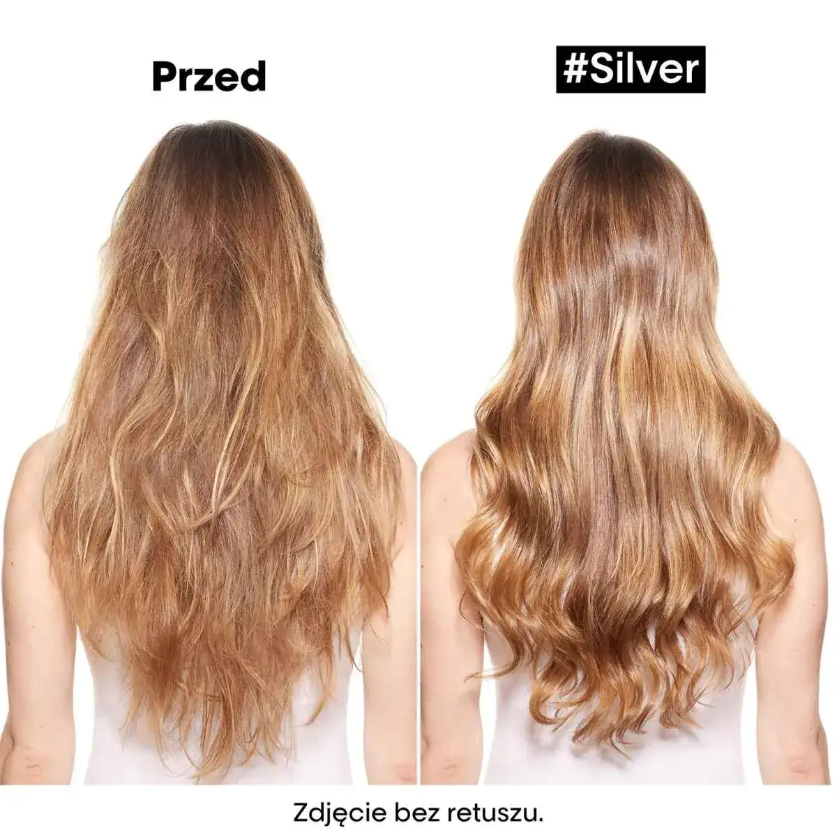 Używaj L’Oréal Professionnel Silver Szampon i po myciu nakładaj Odżywkę Silver – duet intensyfikuje neutralizację i dodaje blasku.